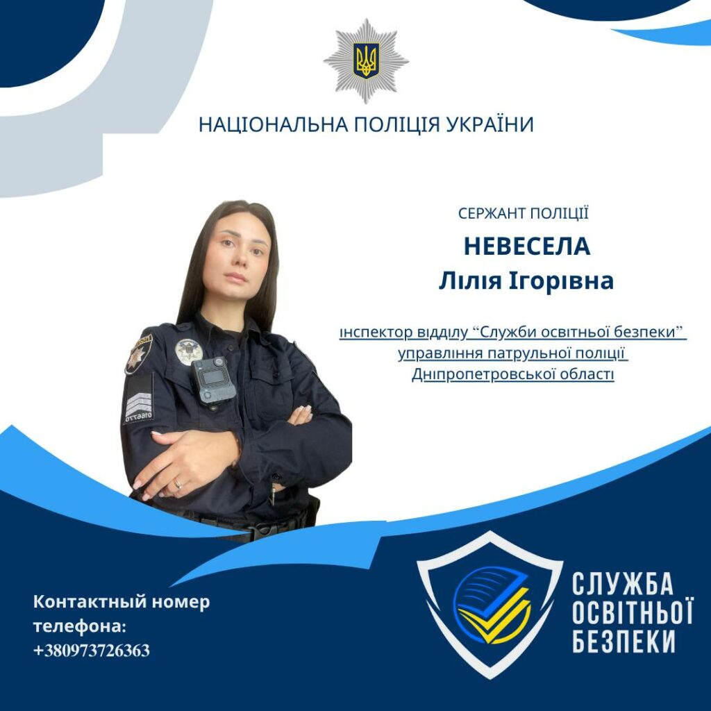 Інспектор відділу «Служби освітньої безпеки» управління патрульної поліції в Дніпропетровській області.
